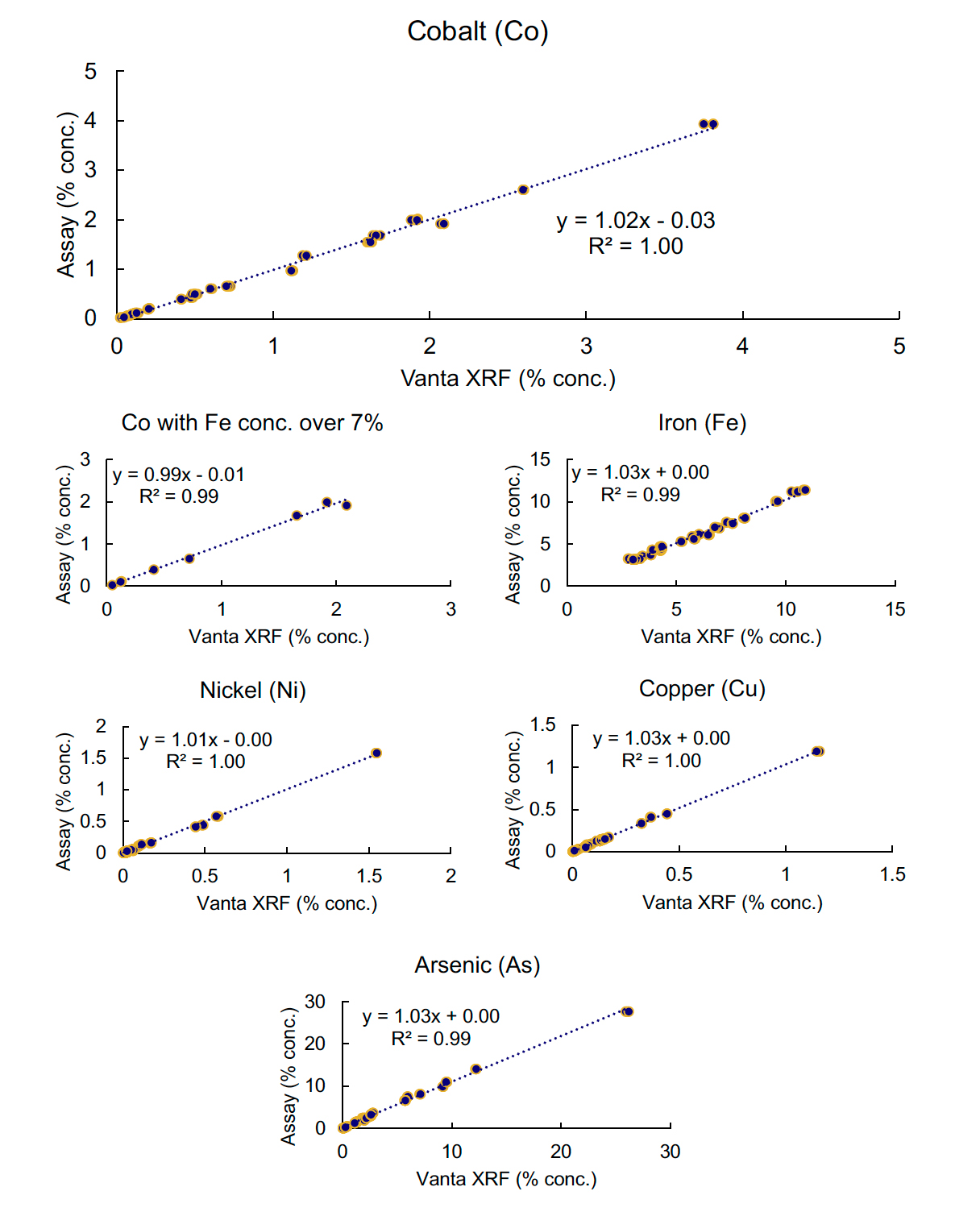 Vanta X射線熒光分析儀得出的數(shù)據(jù)與實驗室數(shù)據(jù)在鈷(Co)含量方面顯示出卓越的相關性,即使在濃度低于0.05%且鐵(Fe)含量超過10%的情況下也是如此。砷(As)、鎳(Ni)和銅(Cu)的數(shù)據(jù)也與實驗室數(shù)值相比展現(xiàn)了極高的準確性。