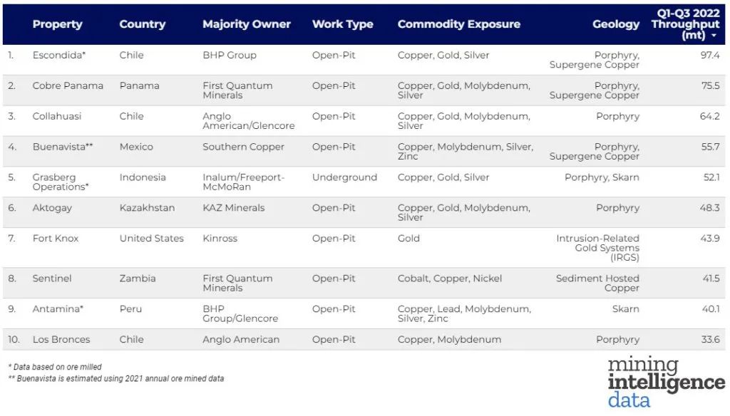 11月25日,礦業情報 (Mining Intelligence) 根據2022年1-3季度的礦石開采量(百萬噸)數據,發布了最新世界十大礦山排名。值得注意的是,除了印度尼西亞的格拉斯伯格礦山 (Grasberg),也是世界第二大銅礦,在2020年由地表轉入地下開采外 其它排名前十的礦山均為露天開采。