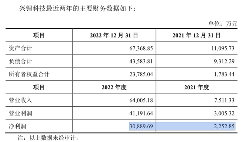 興鋰科技的凈利潤(rùn),2022年3.09億元,2021年2252.85萬元,同比增長(zhǎng)12.71倍。