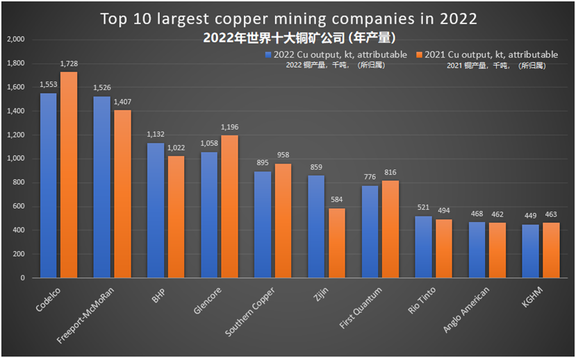 根據2022年所歸屬企業報告的總生產量,世界十大銅礦公司中,世界上最大的銅礦生產商-智利國家銅業公司(Codelco) 的銅產量在2022年減產17.5萬噸,同比下降了10。13%,至155.3萬噸(包含Codelco在El Abra和Anglo American Sur的對應股份產量)。