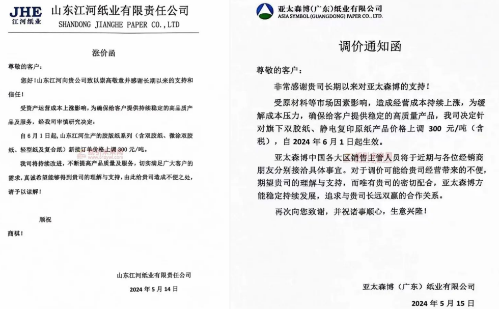 隨著文化用紙行業(yè)巨頭們的一紙公告,市場迎來了6月1日的統(tǒng)一價格上調(diào),每噸產(chǎn)品提價300元。山東江河紙業(yè)新接訂單價格上調(diào)300元/噸,山東華泰紙業(yè)所有文化紙系列產(chǎn)品價格上調(diào)300元/噸,山東晨鳴紙業(yè)文化紙產(chǎn)品價格上調(diào)300元/噸,亞太森博(廣東)紙業(yè)針對旗下雙膠紙、靜電復(fù)印原紙產(chǎn)品價格上調(diào)300元/噸(含稅)。