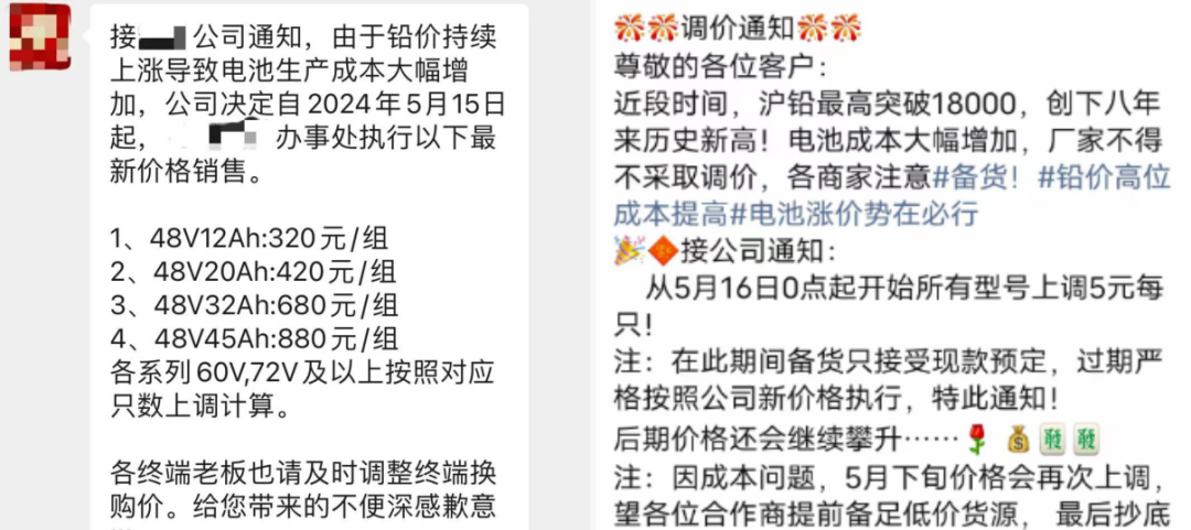某電池品牌表示,從2024年5月15日起,48/12按照320元/組、48/20按照420元/組、48/32按照680元/組、48/45按照880元/組的價格執(zhí)行,各系列60V、72V及以上按照對應(yīng)只數(shù)上調(diào)計算;另有企業(yè)表示,5月16日開始,所有型號電池上調(diào)5元/只,另外由于成本因素,5月下旬價格會再次上調(diào),建議電動車行業(yè)商家合理安排庫存。