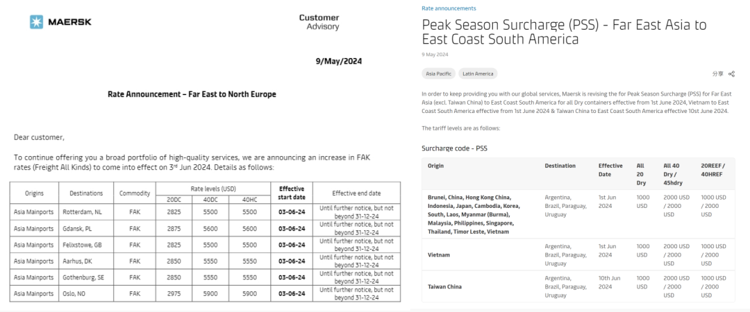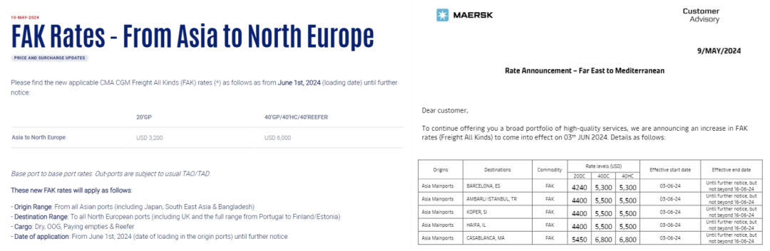 船公司們宣布新一輪運價調(diào)整計劃,馬士基和達(dá)飛兩大航運巨頭已宣布6月再提價計劃,上調(diào)北歐FAK費率。其中,馬士基每40尺柜最高5900美元,達(dá)飛再次上調(diào)1000美元,每40尺柜6000美元。赫伯羅特、HMM等船公司繼續(xù)調(diào)整部分航線的費率,涉及歐地、非洲、南美、北美等。5月上旬美線(運價)已經(jīng)連漲了兩次,每次各漲了1000美元左右,漲價還將繼續(xù),并將在5月下旬飆升到5000美元以上。