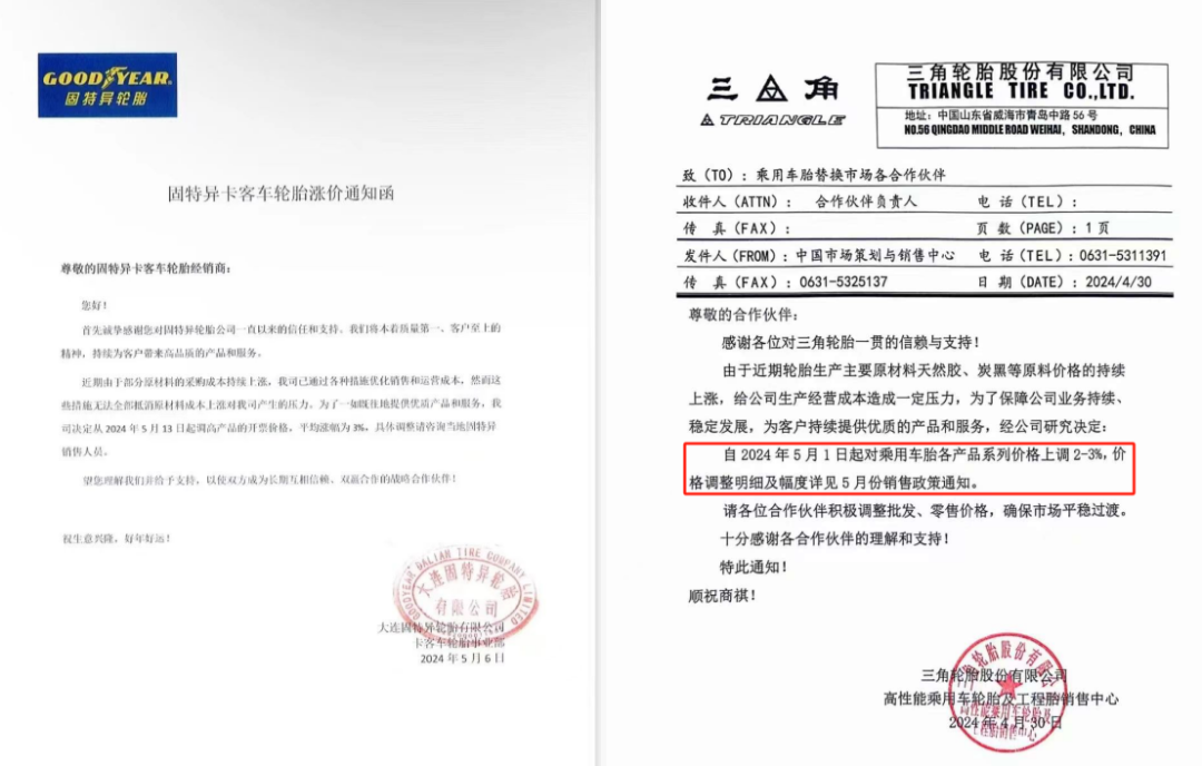 2月以來,已有76家輪胎公司發(fā)布了92份漲價通知。僅在5月就有多家知名企業(yè)宣布產(chǎn)品漲價,漲幅約3%左右。大連固特異輪胎漲幅3%,三角輪胎對乘用車胎各產(chǎn)品系列價格上調(diào)2-3%,上海優(yōu)科豪馬輪胎對乘用車輪胎產(chǎn)品調(diào)漲3%~6%,建泰橡膠(深圳)對建大集團大陸市場PCR輪胎的替換市場價格上調(diào)3%-5%,瑪吉斯輪胎對瑪吉斯乘用車胎調(diào)漲2%。
