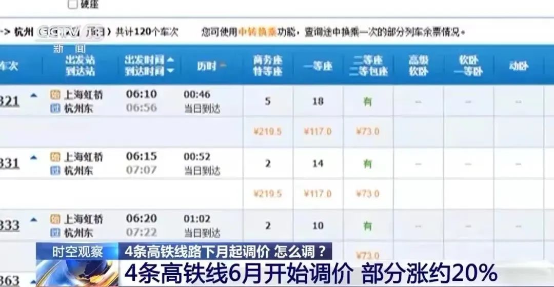 鐵路12306官網(wǎng)發(fā)布四則調(diào)價公告,自6月15日調(diào)整京廣高鐵武廣段、滬昆高鐵滬杭段、滬昆高鐵杭長段、杭深鐵路杭甬段等4條熱門高鐵線路票價,漲幅在19%-20%左右。