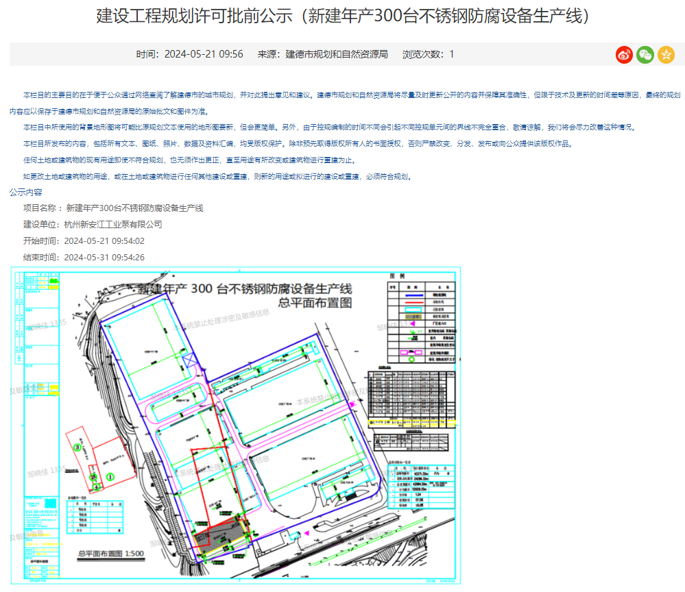 建德市人民政府消息,5月21日,建德市規(guī)劃和自然資源局就杭州新安江工業(yè)泵有限公司新建年產(chǎn)300臺不銹鋼防腐設備生產(chǎn)線建設工程規(guī)劃許可進行批前公示,公示期:5月21-31日。