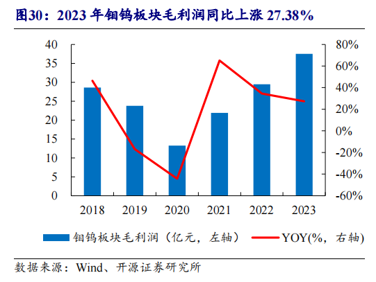 鉬鎢板塊方面,開源證券研報顯示,去年,洛陽鉬業(yè)全年鉬鎢產(chǎn)量合計2.36萬噸,營收為86.11億元,同比增長23.63%,毛利為37.51億元,創(chuàng)歷史最高紀錄。