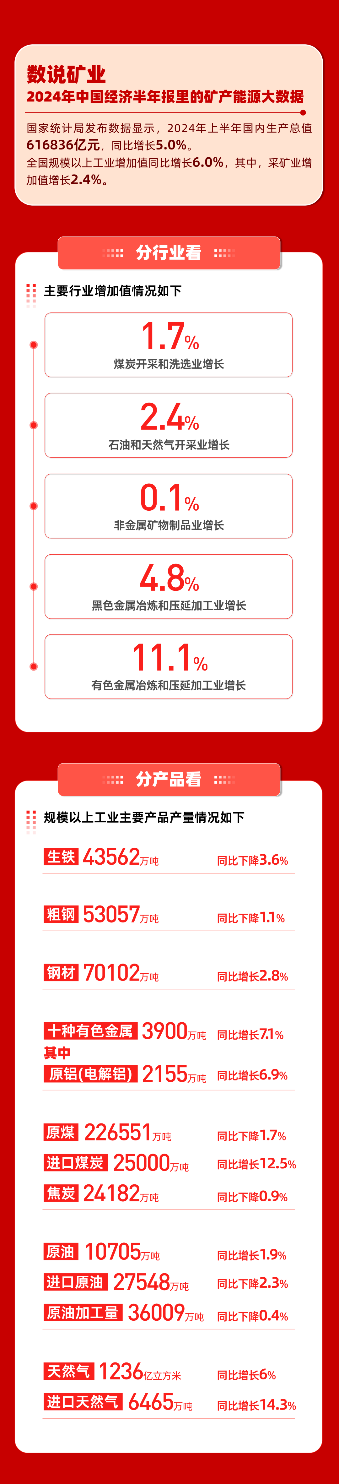 7月15日,國家統計局公布2024年經濟半年報。2024年上半年國民經濟運行總體平穩,國內生產總值超60萬億元,同比增長5%。全國規模以上工業增加值同比增長6%,其中,采礦業增加值增長2.4%。