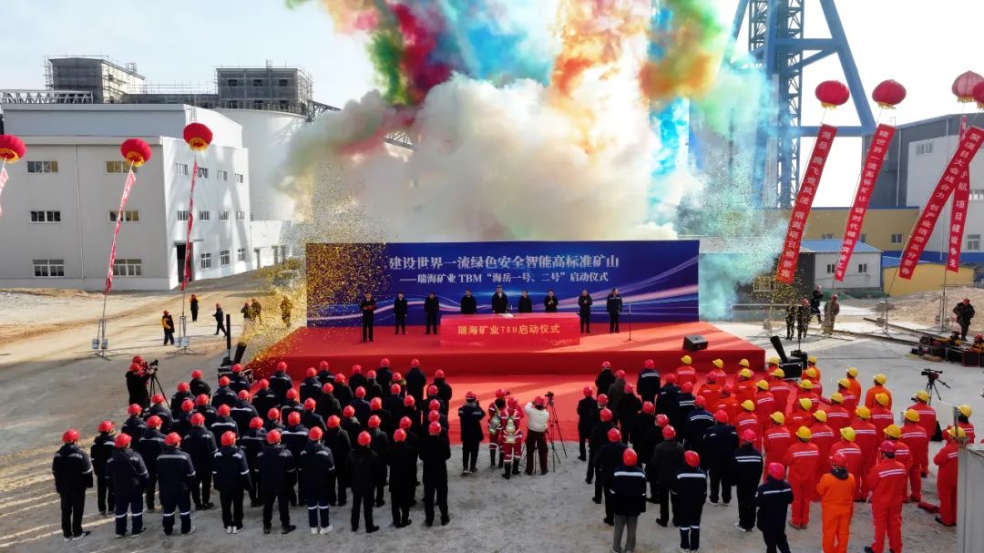 2024年12月30日上午9時36分,瑞海礦業有限公司副井井塔前嘉賓齊聚、彩球飄飄、旌旗獵獵,十二條巨幅標語迎風招展,兩臺TBM(全斷面硬巖隧道掘進機)啟動儀式揭幕,瑞海礦業總經理于明海、浙江省隧道工程集團公司副董事長黃德祥、山東招金礦業股份有限公司董事長姜桂鵬先后作了發言和致辭。上午10時,隨著萊州市政府副市長邱召明宣布“萊州市瑞海礦業有限公司‘海岳一號、海岳二號’TBM發車”,萊州市政府副市長邱召明,招遠市政府副市長荊興業,山東招金集團有限公司副董事長、總經理王樂譯,招金礦業董事長姜桂鵬等嘉賓共同按下啟動球。