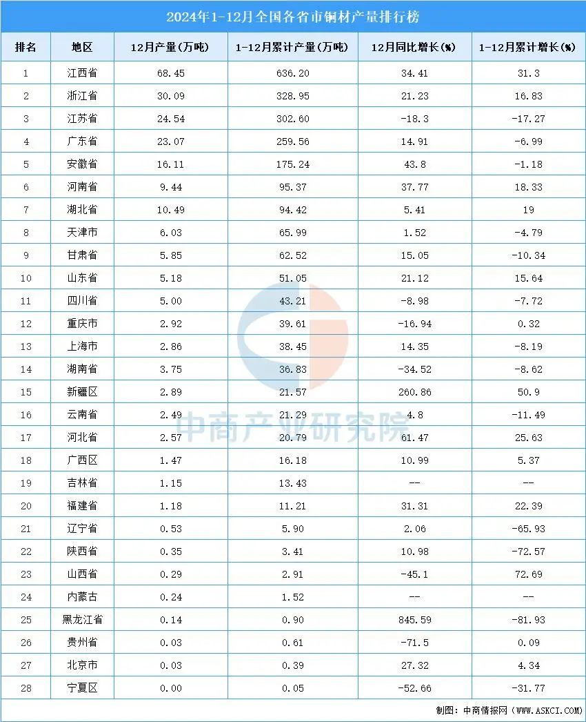 我國銅材產(chǎn)量主要集中在華東區(qū)域,占比約為65.68%,其次是華南(11.73%)、華中(9.64%)、西南(4.46%)、華北(3.90%)、西北(3.73%)、東北(0.86%)。共有28個省份生產(chǎn)銅材,前三名占據(jù)半壁江山。