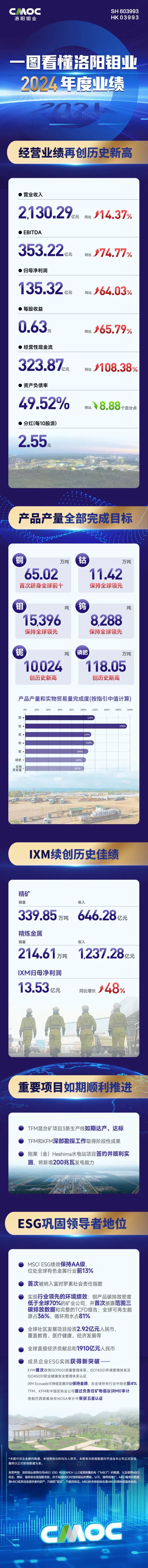 2024年,洛陽鉬業銅、鈷、鈮、磷肥產量創歷史新高:產銅65.02萬噸,同比增長55%,首次躋身全球前十大銅生產商,也是去年全球產銅增量最大的公司,產鈷11.42萬噸;產鈮10,024噸,同比增長5%,磷肥產量118萬噸。公司還產鎢8,288噸,同比增長4%,產鉬15,396噸。IXM協同礦山板塊,提升組織和運營效率,實現歸母凈利潤13.53億元,同比增長48%,再度刷新歷史最佳業績。