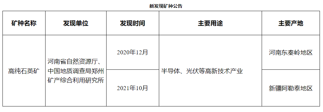記者今天(10日)從自然資源部獲悉,《新發(fā)現(xiàn)礦種公告》近日發(fā)布,其中確定了一個(gè)新礦種——高純石英礦。